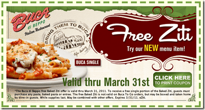 Get a coupon for a FREE single portion of baked Ziti when you buy any pasta or entrée. The coupon is good through March 31st and can actually be combined with other offers (love that!!).